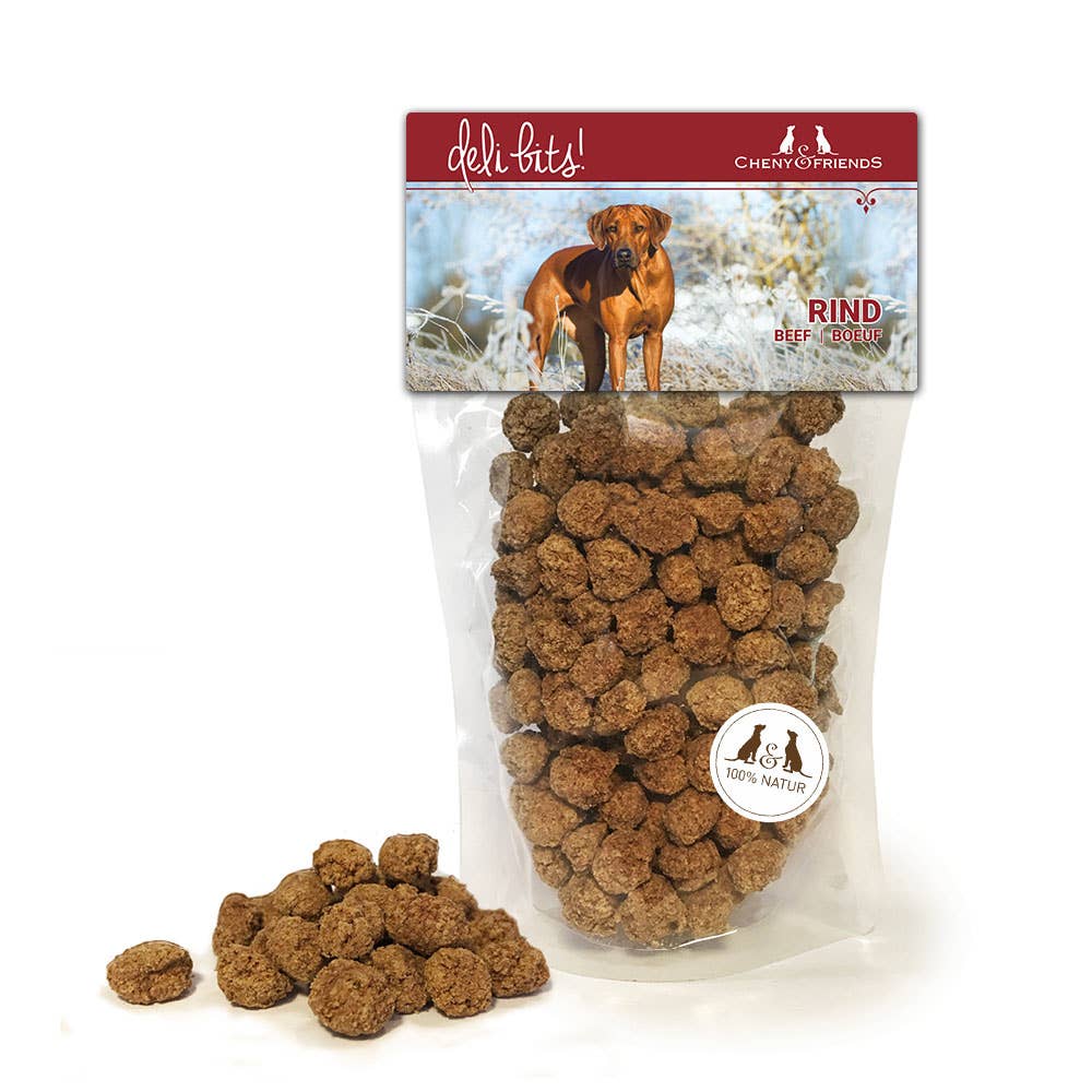 CHENY & FRIENDS DeliBits. Die artgerechte und natürliche Zwischenmahlzeit für zufriedene und gesunde Hunde. Die kleinen weichen DeliBits sind feine Belohnungshappen oder kleine Mahlzeiten. Auch für Welpen und sehr kleine Hunde perfekt geeignet für Training, Suchspiele oder einfach zwischendurch. CHENY & FRIENDS DeliBits Die schmackhafte Zwischenmahlzeit - Schonend verarbeitet - 100% natürlich - Intensiv im Geschmack, daher bestens für’s Training, als Belohnung oder für für Suchspiele geeignet - Handlich klein und weich - Wertvolles Protein sowie wichtige Mineralstoffe und Spurenelemente. - Leicht und bekömmlich - Frei von künstlichen Aromen und Konservierungsstoffen - Bestes Fleisch CHENY&FRIENDS DeliBits bestehen aus schlachtfrischen Rohprodukten in bester Qualität. Diese werden schonend luftgetrocknet, sind unbehandelt und enthalten keine künstlichen Zusatzstoffe. Die handlichen kleinen weichen DeliBits enthalten ausschließlich bestes Fleisch und wichtige Mineralstoffe und Spurenelemente. Sie sind lei